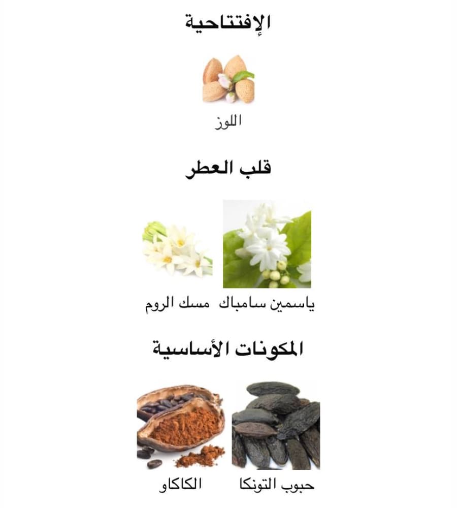 - الكاكاو - تابلي دافئ - الزهور البيضاء - حلو -مسك الروم - العنبر - اللوز - القهوة -