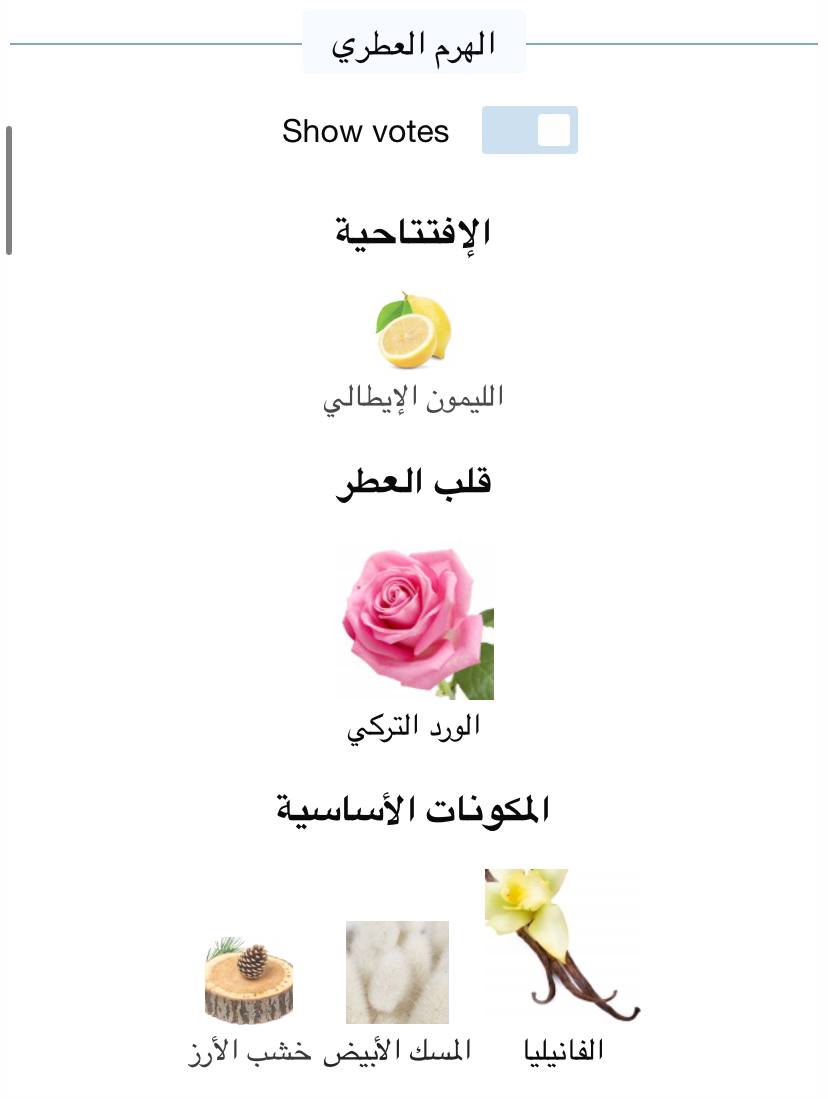 - ورد/الفانيلا/ناعم/مسكي/زهري/خشبي/حلو/الحمضيات