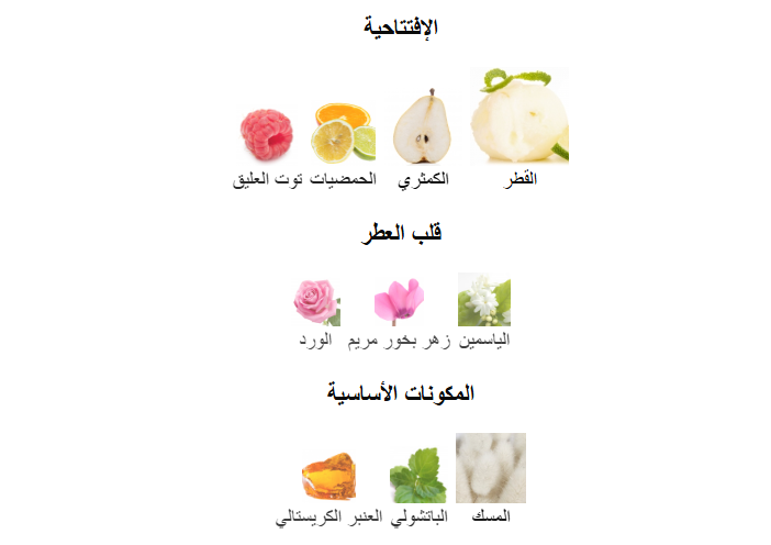 - فاكهي/ حلو/ منعش/ مسكي/ الحمضيات/ الباتشولي/ ناعم/زهري/ ورد