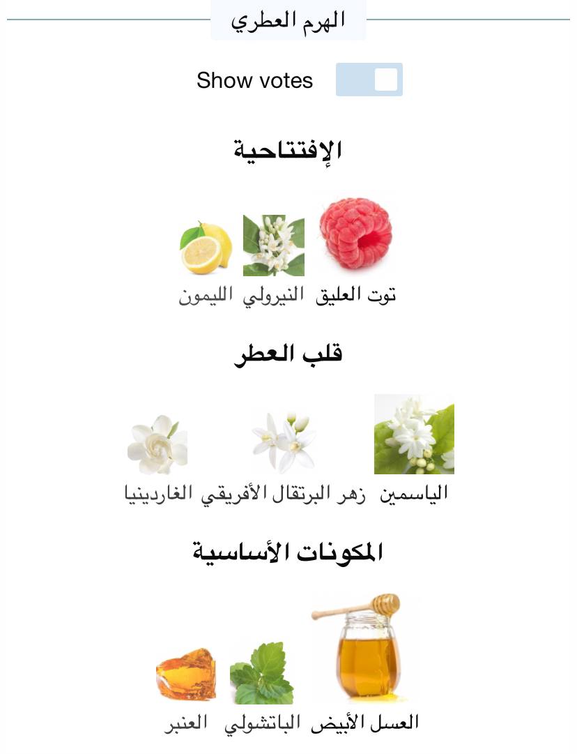 - الزهور البيضاء/حلو/ العسل/الحمضيات/ فاكهي/زهري/الباتشولي/حيواني/العنبر