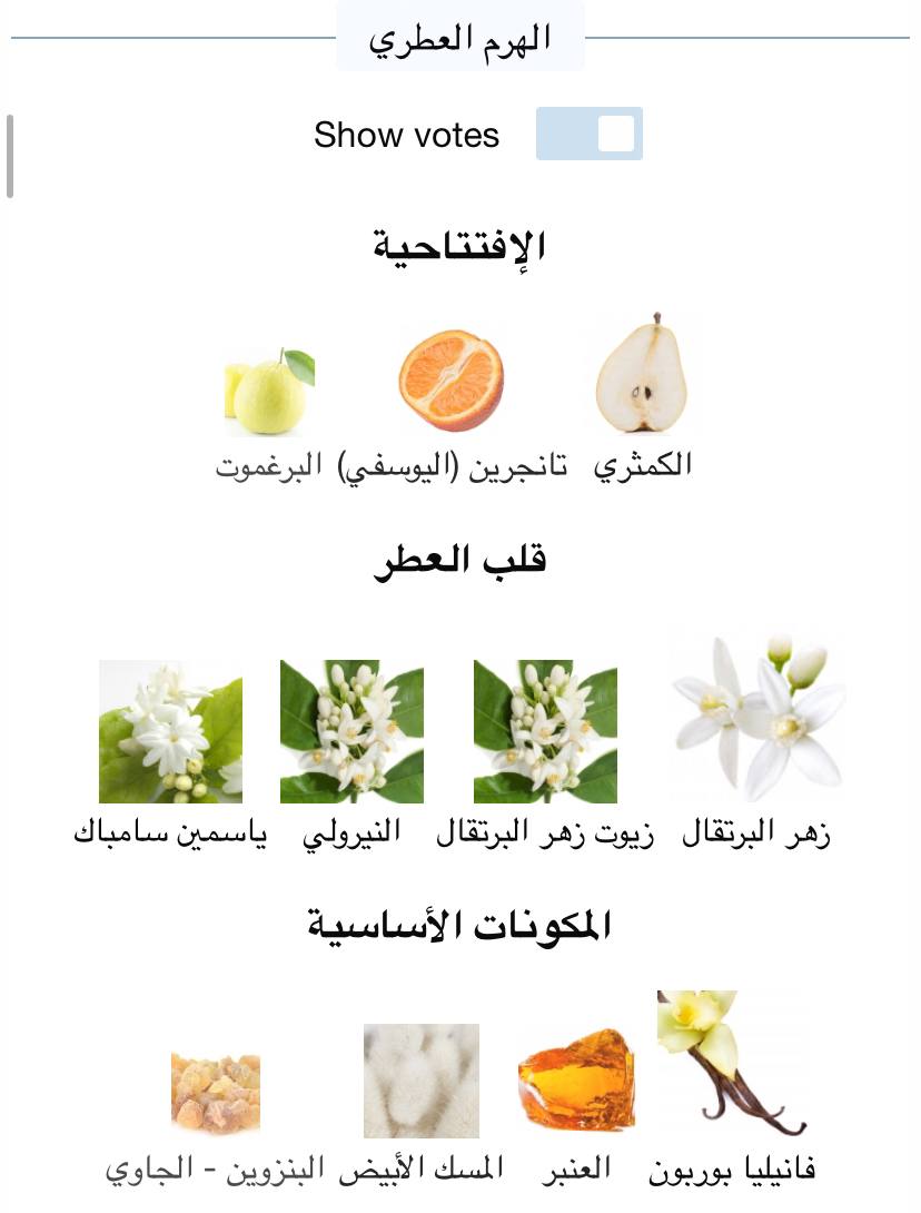 - الحمضيات/حلو/الزهور البيضاء/العنبر/الفانيلا/ناعم/فاكهي/مسكي/منعش/حيواني