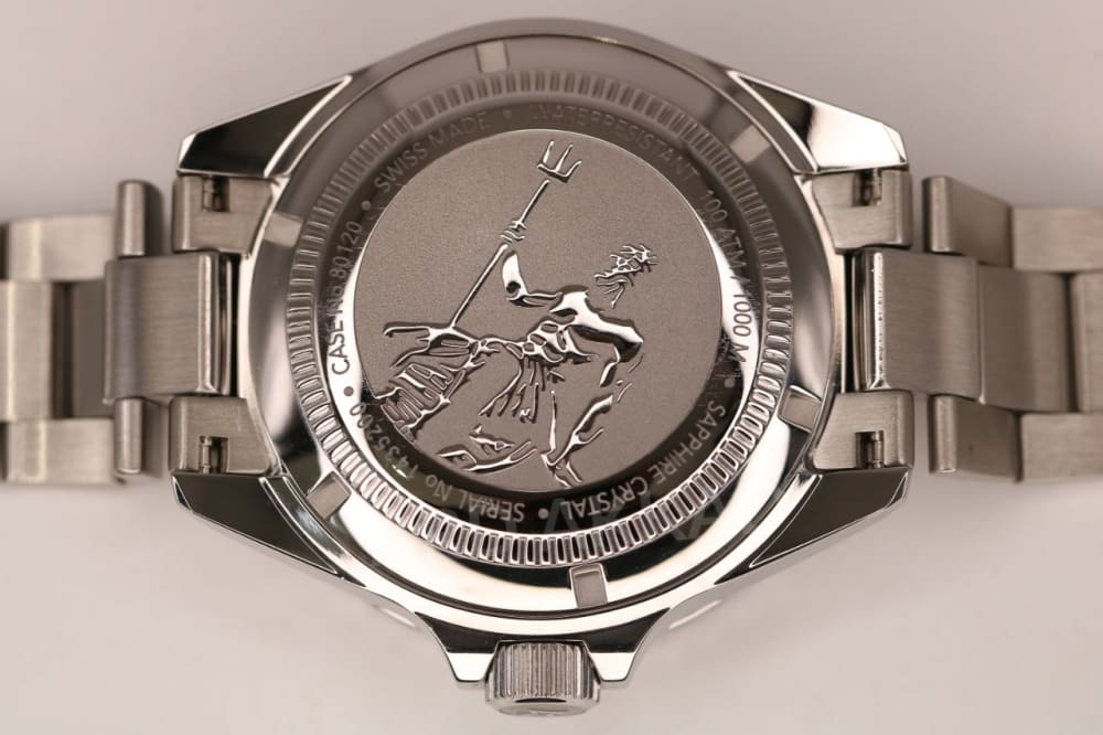 • يوجد على ظهر الساعة ختم شخصية ملك البحر في الاساطير الرومانية
