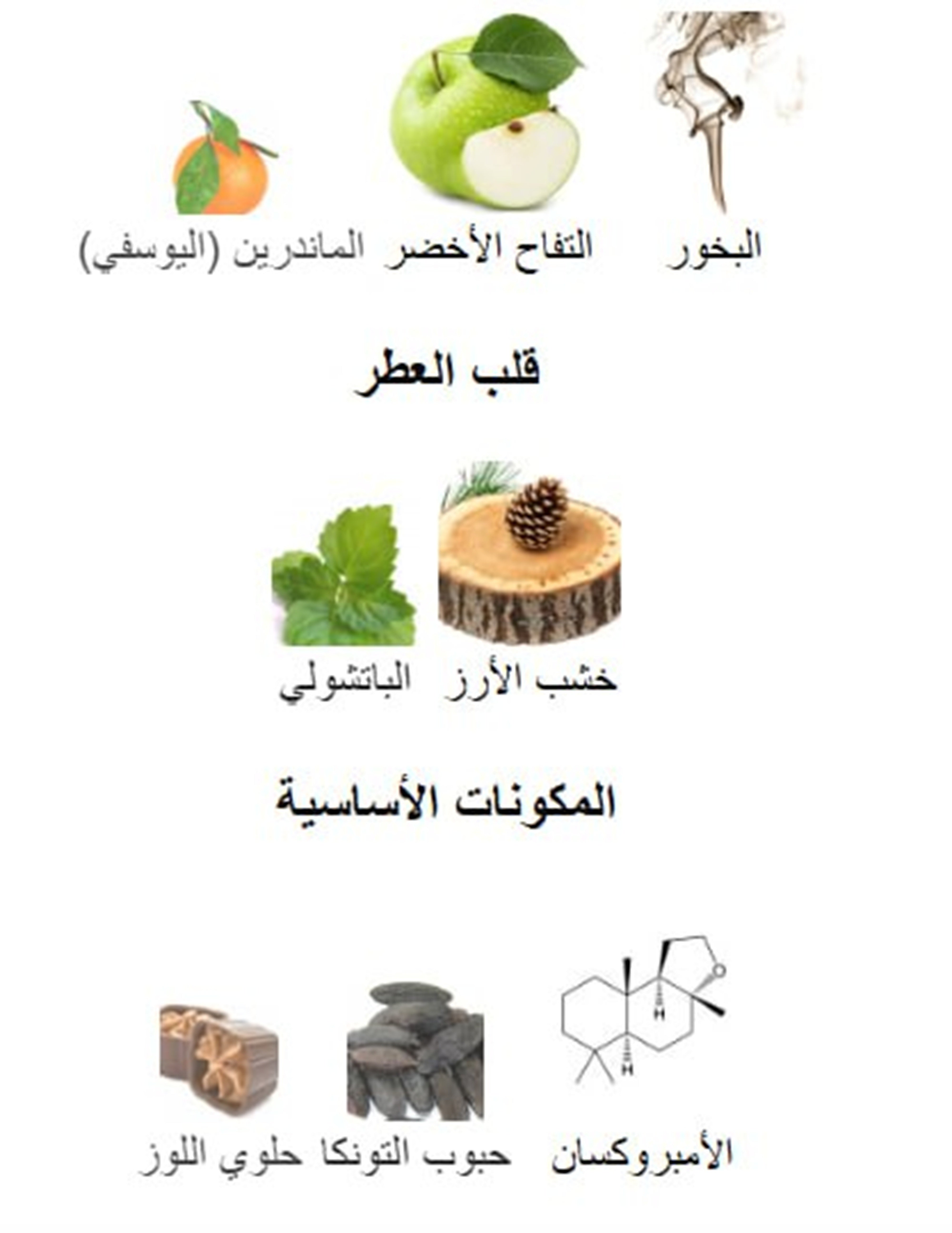 - العنبر /خشبي/ فاكهي / تابلي دافئ / حلو / مدخن / بلسمي / الباتشولي / مسكي / الحمضيات