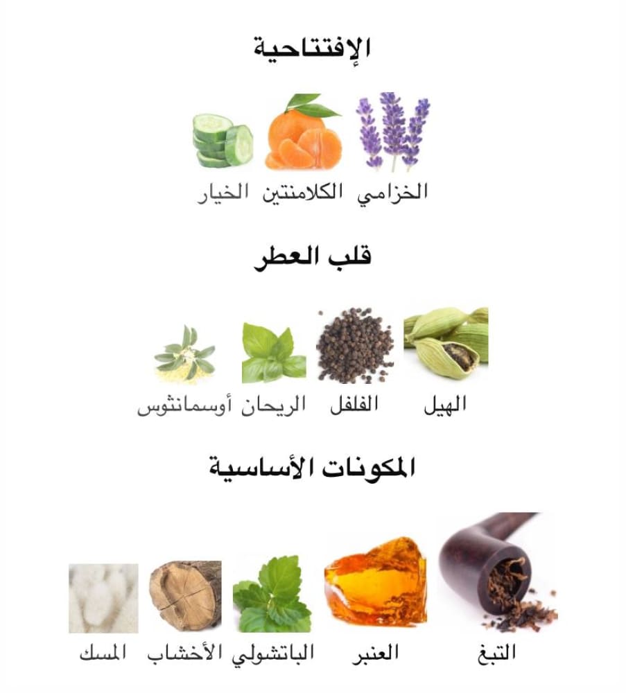 - تابلي دافئ - التبغ - العنبر - حلو - تابلي منعش - خشبي - اروماتك - الباتشولي - الخزامي - الحمضيات