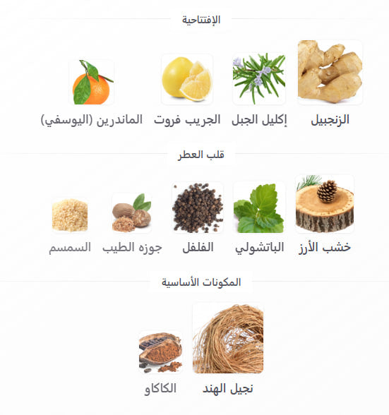 خشب الارز / الباتشولي / الفلفل / جوزة الطيب / السمسم