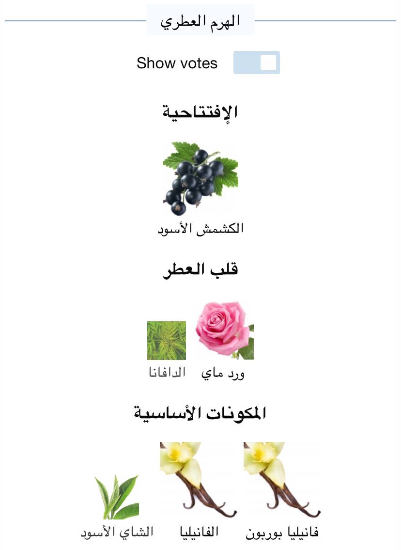 - خشبي/الفانيليا/ اروماتك/ توابل ناعم/فاكهي/عشبي/زهري/خشبي/ورد/بلسمي/ناعم