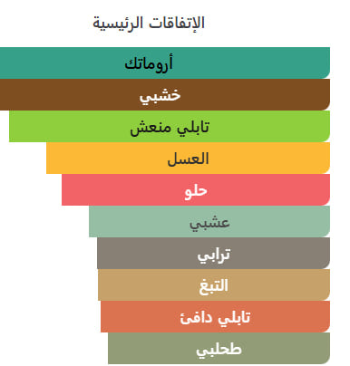 خشبي / اروماتكتابلي منعش / العسلحلو / عشبيترابي / التبغتابلي دافئ / طحلبي -