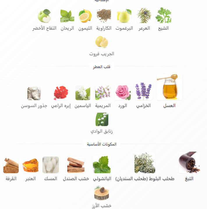 العسل / الخزامى / الورد / المريمية / الياسمين / ابرة الراعي / جذور الياسمين / زنابق الوادي