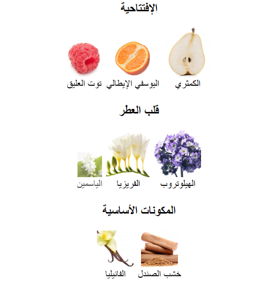 - فاكهي / الفانيليا / حلو / ناعم /زهري /الحمضيات /خشبي /الزهور البيضاء /اللوز /مائي