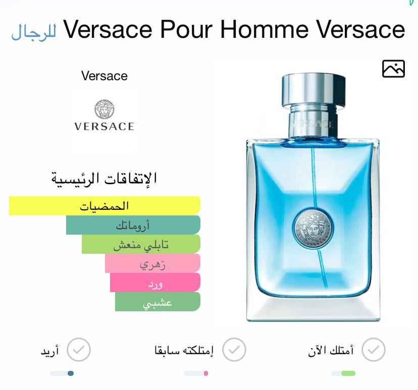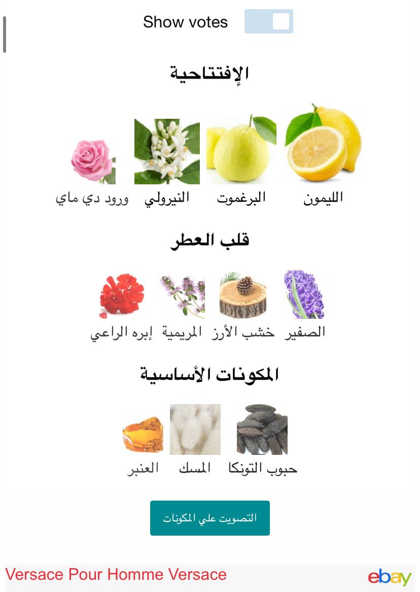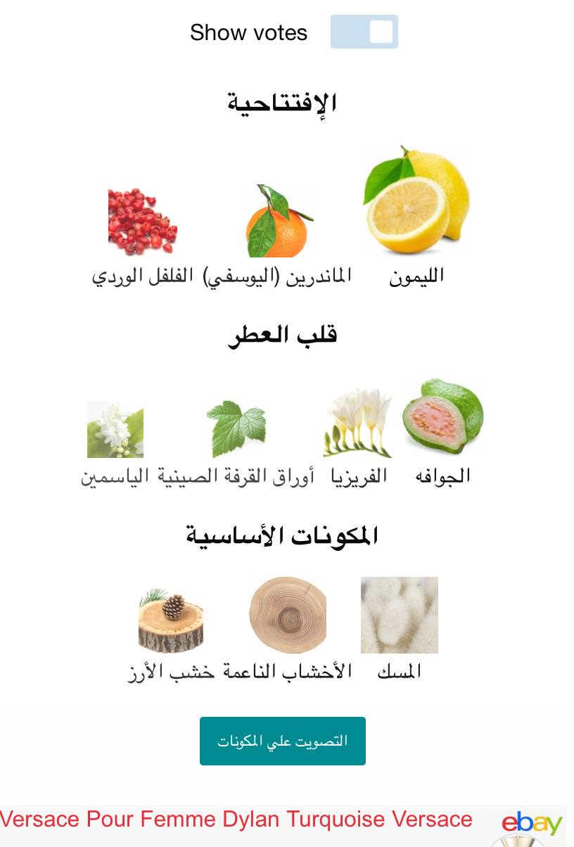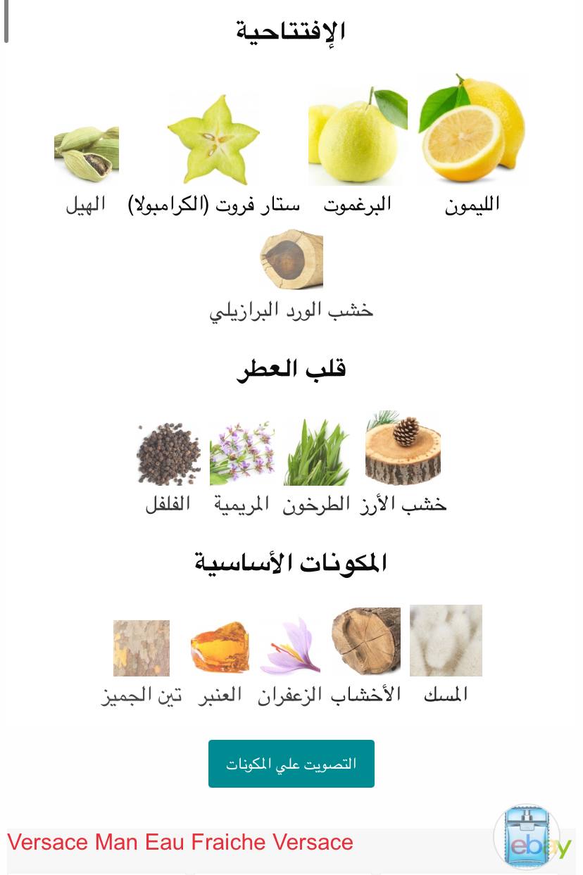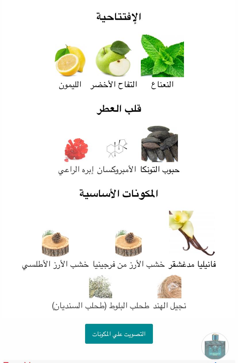 - المكونات (عطر حمضي من الليمون، واروماتك، وورود النيرولي والدي ماي، ويجمع بين زهور المريمية وخشب الأرز، وقاعدة من المسك والعنبر وحبوب التونكا)