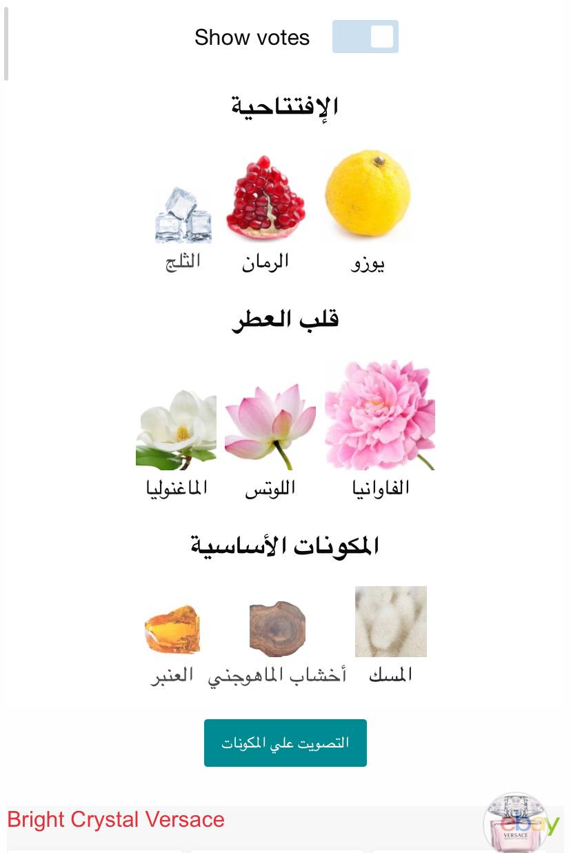 - المكونات (فاكهة اليوزو والرمان مع زهرة الفاوانيا واللوتس والماغنوليا مع قاعدة ناعمة من المسك والعنبر)
